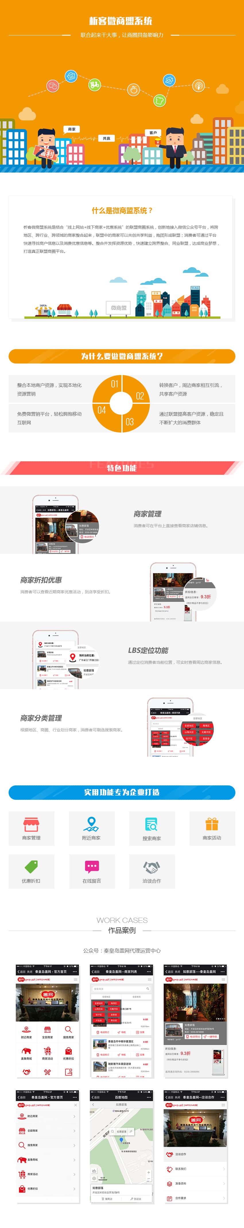 析客微商盟系统是结合“线上网站+线下商家+优惠系统”的联盟商圈系统,创新地接入微信公众号平台,将跨地区、跨行业、跨领域的商家整合起来,联盟中的商家可以共创共享利益,抱团形成联盟;消费者可通过平台快速寻找商户信息以及消费优惠信息等。