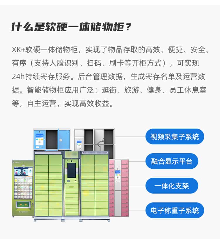 XK+软硬一体储物柜,实现了物品存取的高效、便捷、安全有序(支持人脸识别、扫码、刷卡等开柜方式),可实现24h持续寄存服务。后台管理数据,生成寄存名单及运营数据。智能储物柜应用广泛:逛街、旅游、健身、员工休息室等,自主运营,实现高效收益。