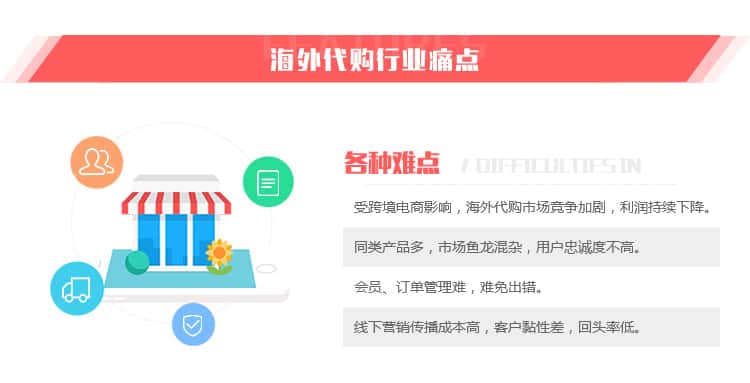 受跨境电商影响,海外代购市场竞争加剧,利润持续下降同类产品多,市场鱼龙混杂,用户忠诚度不高。会员、订单管理难,难免出错线下营销传播成本高,客户黏性差,回头率低。